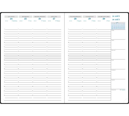 Découvrez notre agenda Vérone au design raffiné avec une couverture amovible en simili cuir lisse et des finitions haut de gamme, dont une piqûre sellier soignée. Organisez facilement votre semaine grâce à une vue d'ensemble sur deux pages en format vertical, couvrant une large plage amplitude horaire de 7h à 22h du lundi au dimanche. Un mini calendrier est placé en haut à droite, accompagné de blocs mémo pour noter les priorités de chaque jour de la semaine.Cette édition française est conçue avec une reliure brochée cousue pour une plus grande solidité.