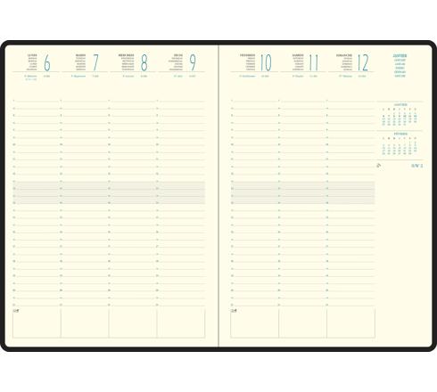Pages spécifiques : les calendriers semestriels de l'année en cours et de l'année suivante, un planning mensuel de l'année en cours et de l'année suivante, un répertoire téléphonique indexé amovible, facile à déplacer et à conserver dans son agenda l'année suivante.