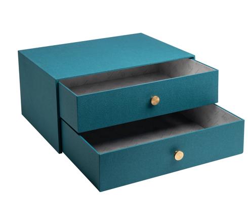High strength 3mm cardboard, easy to slide drawers with gold button. Plastic-free logo paper interior.