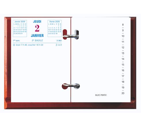 Page de gauche avec la date et les calendriers des mois en cours et suivant. Page de droite pour noter les rendez-vous de 8h à 20h.