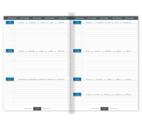 La semaine sur 2 pages à l'horizontale. Couverture cartonnée avec un pelliculage brillant, reliure brochée cousue pour une plus grande solidité.