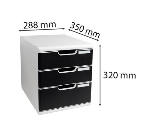 Boxes have the same height as a lever arch file and can be put together either horizontally or vertically (MODULO A4 and A3 compatible).