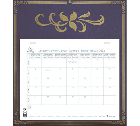 Un décor intemporel avec son décor doré. 12 feuillets mensuels détachables, présentation du mois sous forme de cases. Indication des jours fériés. Multilingue. Perforation pour accrocher le calendrier.