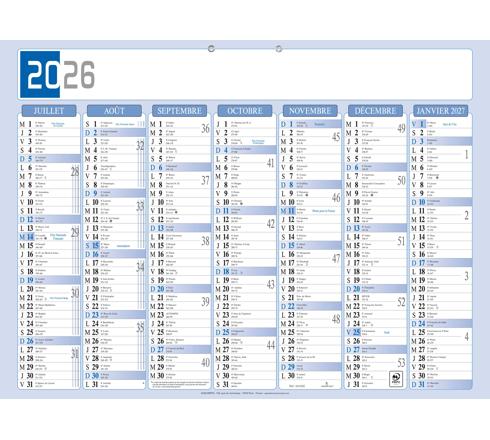 Avec l'indication des vacances scolaires, les dimanches et les jours fériés sont imprimés en bleu pour les repérer facilement, de la place pour écrire sur chaque jour. Recto 7 mois : janvier - juillet. Verso 7 mois : juillet - janvier.