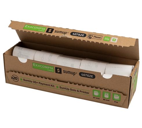 EXACOMPTA SUMUP REF: 40762E - 57 X 30MM, 55GSM THERMAL PAPER RECEIPT ROLLS, FOR SUMUP 3G+ PAYMENT KIT AND SUMUP SOLO WITH PRINTER, ZERO PLASTIC WASTE, RECYCLABLE, 9M, WHITE, BOX OF 20 - WHITE