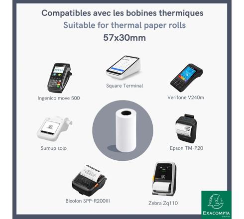 Format de la bobine : 57 mm de laize (largeur) et 30 mm de diamètre. Métrage : 9 m. Mandrin standard de 12 mm. Convient à toute marque de terminal de paiement thermique.