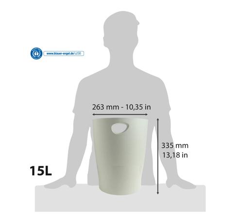Waste paper bin with generous capacity of 15 litres.