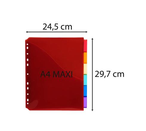 Exacompta PP Dividers, A4, maxi, 6 part The Exacompta dividers are made from 2mm translucent polypropylene material. The dividers are A4 maxi in size and are pre punched so they can be inserted into most files and folders. The dividers have label holders on the tabs so they can be identified and are supplied with an A4 sheet of micro perforated labels that can be personalised. The dividers come in 6 sections and each divider has a corner pocket on the front to store loose documents up to A4 size Plain Tabs