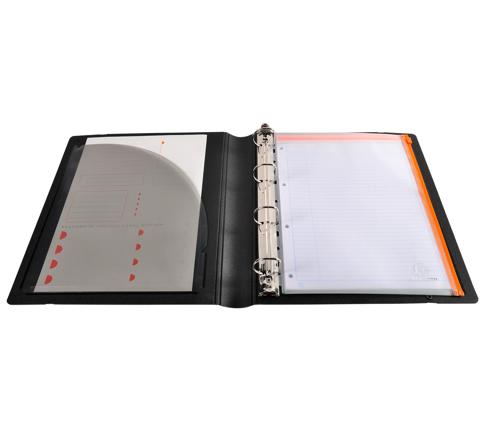 L'Exafile est également équipé d'un porte-bloc avec bloc-notes, d'une pochette intérieure pour insérer des documents, ainsi que d'une pochette zippée perforée pour ranger et protéger de petits objets ou documents. Pour documents A4 et A4+, idéal pour utiliser avec des pochettes perforées et intercalaires A4+.