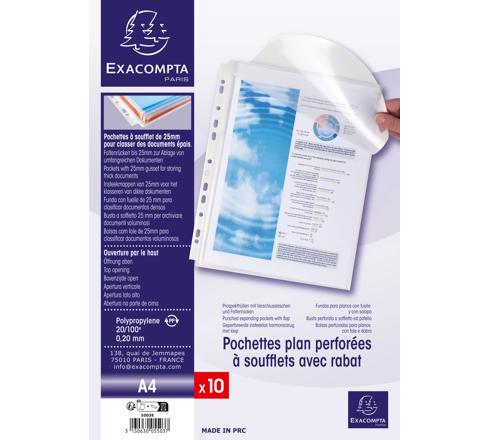 Exacompta Expanding Punched Pockets, Clear, A4, Pk 10 Top opening 25mm gusset with flat 197mm height front pocket Pre punched left tab to make it easy to insert into file or folders Made from polypropylene