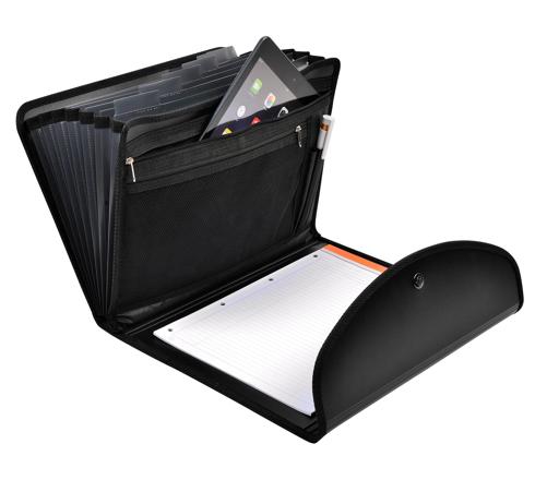 Trieur 6 compartiments avec porte-bloc et bloc-notes,avec compartiment renforcé pour tablette, pochettes avec fermeture zip et porte-stylo. Le porte-bloc s'adapte à tous les blocs et cahiers à spirales.