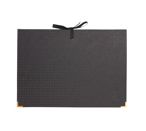 Étiquettes adhésives fournies pour coller sur les onglets. Fermeture ruban et coins métal or pour renforcer la couverture.