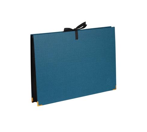 Étiquettes adhésives fournies pour coller sur les onglets. Fermeture ruban et coins métal or pour renforcer la couverture.