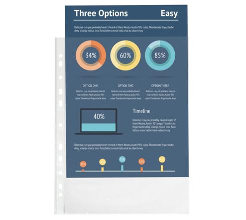 Bag of 100 punched pkts perforated Polypropylene Premium grained,0.8mm - A4 In polypropylene 0.8mm, grained, this punched pocket is designed for everyday use. It has 11 perforations with reinforcing tape to withstand handling and suit any workbook. Its grainy surface simplifies the insertion of documents while maintaining a beautiful transparency. Insertion of documents by the top of the wallet. Size to be classified: A4.