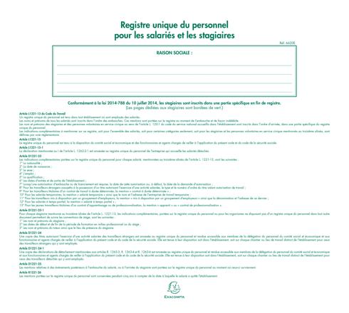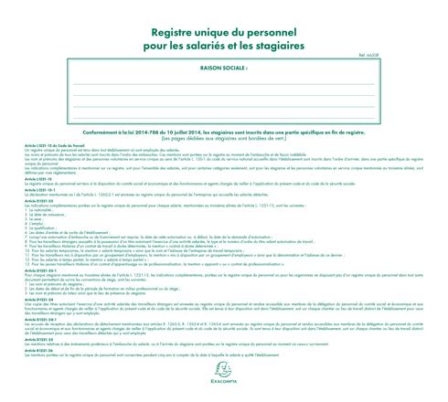Le registre unique du personnel permet de tenir à jour la liste des salariés et des stagiaires d'une entreprise. Les noms et prénoms des salariés doivent être inscrits dans l'ordre des embauches de façon indélébile. Les stagiaires sont inscrits dans une partie spécifique en fin de registre.