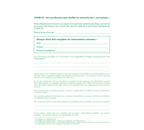 Obligatoire sur l'ensemble du territoire français, pour tous les restaurants, cafétérias et établissements de restauration rapide dans le cadre du protocole sanitaire renforcé de lutte contre le COVID-19.