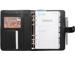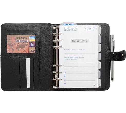La semaine sur 2 pages à la verticale - amplitude horaire du lundi au vendredi 8h à 20h, samedi 8h à 13h et espace de notes pour le dimanche. Papier blanc impression en bleu et gris. 4 fentes pour cartes de crédit dont 1 emplacement carte avec fenêtre transparente. 1 poche pour glisser des papiers. 1 fente pour bloc note en 3e de couverture.