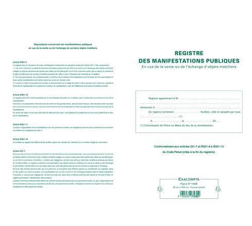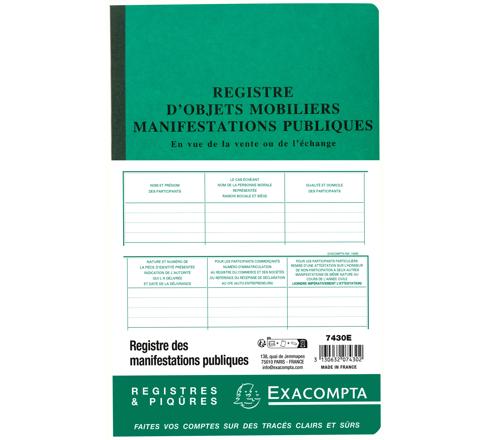 Tout organisateur d'une vente au déballage (brocantes, vide-greniers... ) est tenu d'établir un registre des vendeurs. Le registre Exacompta permet ainsi très facilement de noter toutes les mentions légales et obligatoires : nom et prénom des particpants ou nom de ma personne morale, qualité et domicile, numéro d'immatriculation pour les commerçants nature, numéro et date de la pièce d'identité pour les personnes physiques.