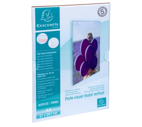 Wall pocket vertical A4 The Exacompta wall pockets are ideal for displaying photos or documents. Made of high quality acrylic (PMMA) with very high transparency. This sign holder can be screwed to the wall using the holes provided or glued using the adhesive strips supplied. Made in Europe, it is guaranteed for 5 years and is UV resistant so it will not yellow You can easily create your personalised signs in the right size with KREAMAN on www.exacompta.com