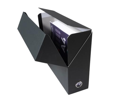 En carton rigide recouvert de papier toilé teinté, cette boite transfert est très pratique pour archiver proprement tous les dossiers volumineux.