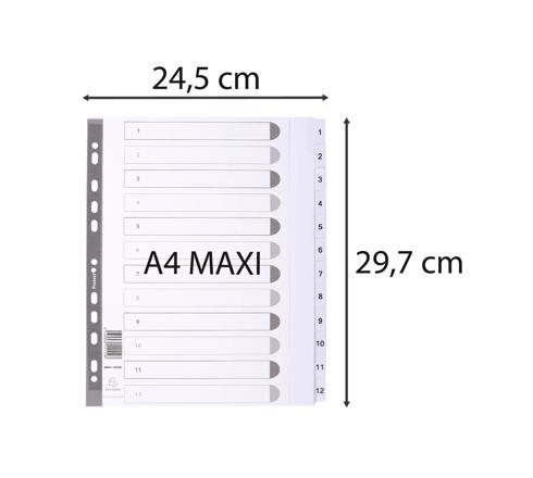 Dividers White Mylar A4 Maxi 1,12 Indices printed 160gsm white card with white reinforced plastic tabs Printed index page for identifying contents 12 Positions 12 Parts 1 to 12 Pack Size 25