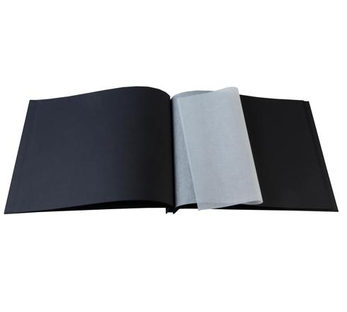 Las páginas interiores están confeccionadas en cartón negro rígido de 250 g, conocido por su alta calidad y durabilidad. Las hojas protectoras de cristal permiten pegar fotos tanto en el anverso como en el reverso de las páginas sin comprometer su calidad, proporcionando una excelente conservación de las imágenes.