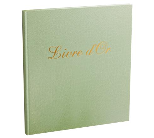 Chaque livre d'or est habillé d'une couverture texturée imitation croco, rehaussée d'un marquage doré délicat et d'une tranche or qui illumine les pages avec élégance.