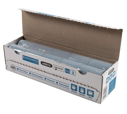 Formato de la bobina: 57 mm de ancho y 40 mm de diámetro. Longitud (+ o - 2m): 18 m. Mandril estándar de 12 mm. Aviso de fin de tirada. Con texto Safe Contact en la parte trasera y logo de Exacompta.