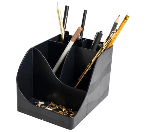 Los cubiletes PEN WAVE ofrecen un diseño pensado para una gran capacidad de almacenamiento sin comprometer la estabilidad. Con sus 4 compartimentos altos, puedes guardar utensilios de tamaño considerable como tijeras y bolígrafos de manera ordenada y accesible. Además, cuenta con un compartimento bajo adicional ideal para objetos pequeños como clips, chinchetas, memorias USB e incluso tu teléfono móvil. Con medidas de 155x119x109 mm, es la solución perfecta para mantener tu escritorio organizado y eficiente.