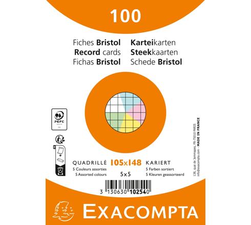 PAQUET DE 100 FICHES SOUS FILM - BRISTOL QUADRILLÉ 5X5 NON PERFORÉ 105X148MM - COULEURS ASSORTIES