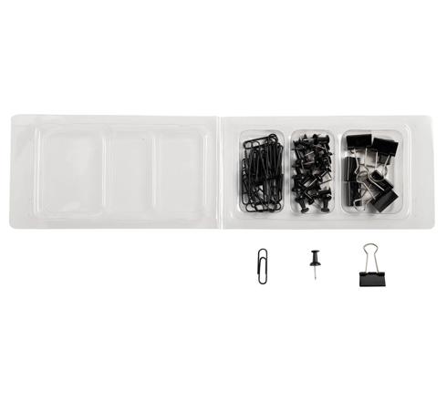 Le kit est composé de 20 push pins, 30 attache-lettres (trombones) et 8 double clips en métal, le tout dans un étui plastique à 3 compartiments.