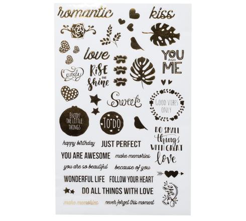 Deux planches de stickers aux motifs classiques couleurs pastel et deux planches de stickers originaux et tendance couleur or, avec au total 300 stickers.