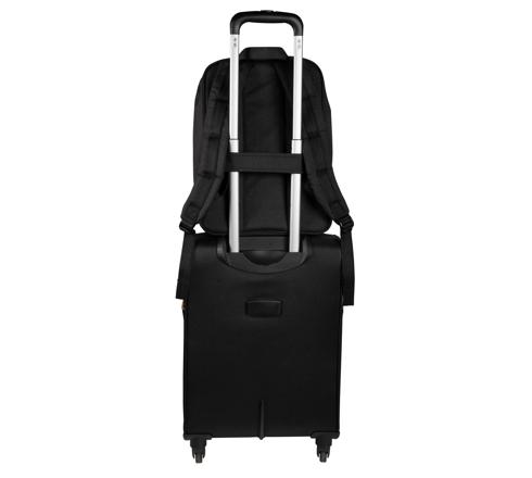 Sangle passante au dos pour glisser le sac dans la poignée télescopique d'une valise ou d'un trolley.