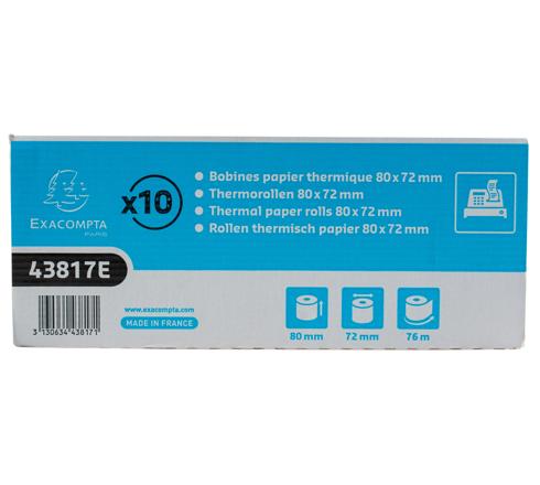 Format de la bobine : 80 mm de laize (largeur) et 72 mm de diamètre. Métrage (+ ou - 2m) : 76 m. Mandrin standard de 12 mm. Convient à toute marque de caisse thermique.