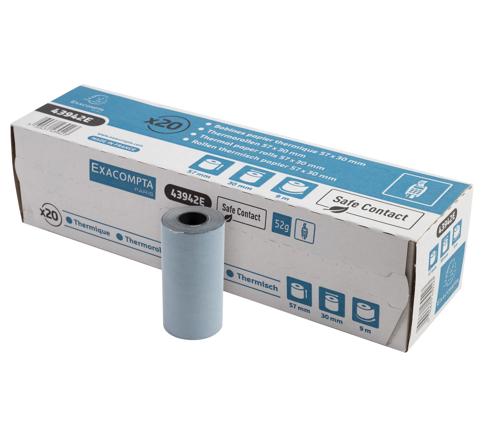 Format de la bobine : 57 mm de laize (largeur) et 30 mm de diamètre. Métrage : 9 m. Mandrin standard de 12 mm. Avertissement de fin de rouleau. Avec mention Safe Contact au verso et logo Exacompta.