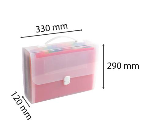 Cette valisette entièrement en polypropylène, avec poignée rigide, présente une très large capacité de classement d'environ 800 feuilles réparties en 24 compartiments.