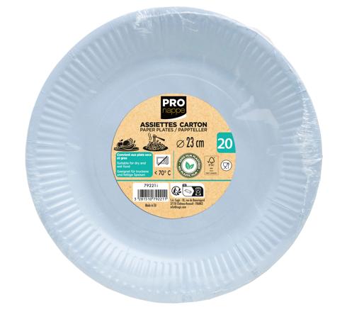 Le paquet comprend 20 assiettes rondes en carton d'un diamètre de 23 cm.