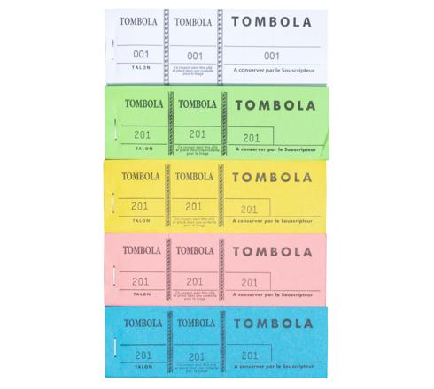 BLOC TOMBOLA 100 FEUILLETS NUMÉROTÉS DE 3 VOLETS - FORMAT 4,8X15 CM - COULEURS ASSORTIES