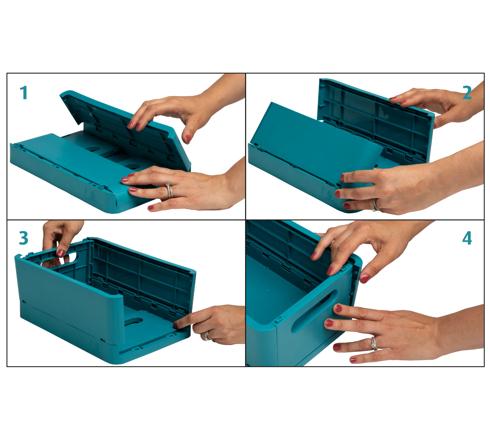 Respectueuse de l'environnement, cette boîte pliable est fabriquée en plastique recyclé issu des déchets ménagers et est ainsi certifiée GRS.