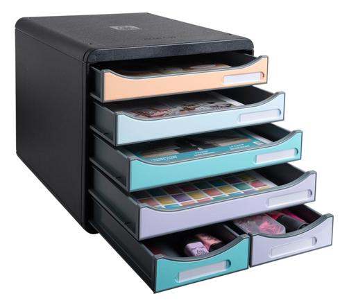 Le Module de classement Big Box Maxi Aquarel d'Exacompta est composé de 6 tiroirs, 4 grands et 2 petits pour classer des documents en format A4 et A4+, des pochettes à élastiques 24x32cm, des enveloppes grands formats mais aussi de petits objets de bureau comme des posts it, trombones, capsules de café... Il est adapté à un usage bureau, home office ou scolaire.