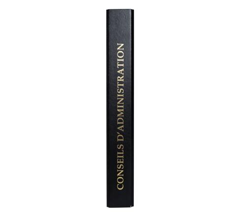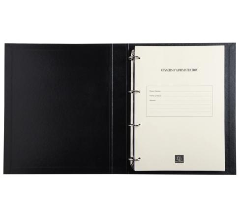 La reliure Exacompta Conseil d'Administration est composée d'un classeur rembordé plastique, 4 anneaux en D en 3ème de couverture (ouverture simultanée des 4 anneaux), avec titre imprimé en doré sur la couverture et au dos du classeur. Elle est équipée d'une recharge de 100 feuilles vierges et foliotées, avec page de garde Conseil d'administration personnalisable.