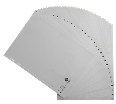 Register A4 für Ringbuch und Ordner aus grauem, flexiblen Recycling-PP 120µ, 31 bedruckte Taben 1-31. Mit Universallochung. Für eine einfache und übersichtliche Organisation Ihrer Unterlagen.