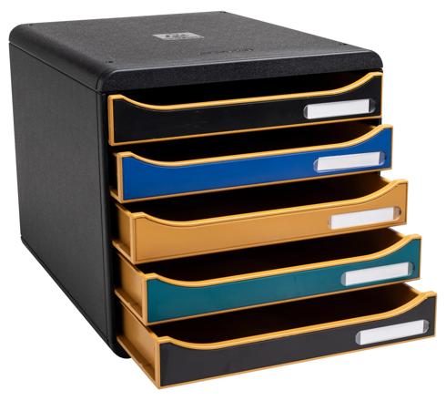 Die Schubladenbox Big Box Plus Neo Deco von Exacompta verfügt über 5 Schubladen, in denen Sie Dokumente im Format A4 und A4+, Sammelmappen mit Gummizug 24x32cm oder großformatige Umschläge ablegen können. Sie eignet sich für den Einsatz im Büro, Home Office oder in der Schule.