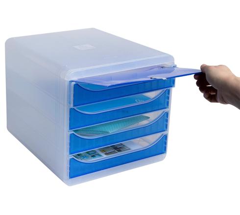 Die Schubladenbox Big Box Plus von Exacompta verfügt über 4 Schubladen, in denen Sie Dokumente im Format A4 und A4+, Sammelmappen mit Gummizug 24x32cm oder großformatige Umschläge ablegen können. Sie eignet sich für den Einsatz im Büro, Home Office oder in der Schule.