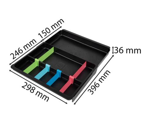Sie ist dank der verschiebbaren Stege mit den meisten Ablagebox-Schubladen kompatibel, die Breite ist variierbar zwischen 246 und 396mm. Sie ist auch mit den Exacompta BIG-BOX (PLUS) Schubladen kompatibel.