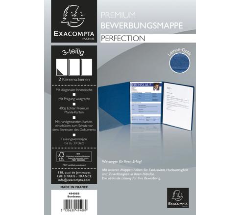 BEWERBUNGSMAPPE AUS COLORSPAN-KARTON 400G/QM MIT LEINENOPTIK, SERIE PERFECTION, 3-TEILIG MIT 2 KLEMMSCHIENEN UND INNENTASCHE, DIN A4 - BORDEAUXROT