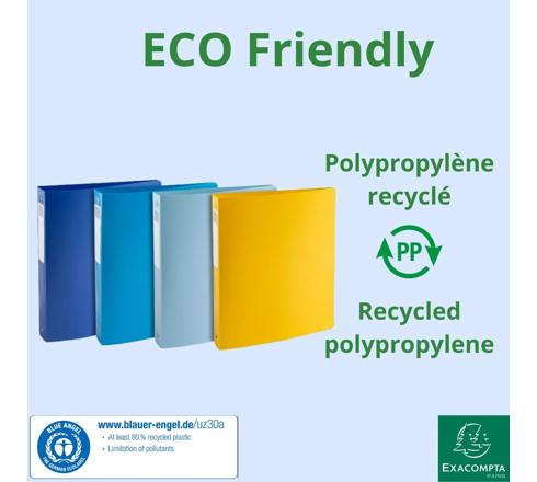 Mittelfestes, robustes Ringbuch. Hergestellt aus transluzentem Recycling-PP für eine bessere Sichtbarkeit des Inhalts.
