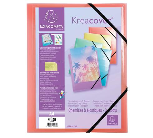 Die Sammelmappe Kreacover Pastell hat eine Hülle/Tasche auf der Vorderseite, in die man ein personalisiertes Blatt in A4 einschieben kann. Auf www.exacompta.com finden Sie mehr Informationen über die KREAMAN, eine Anwendung, die Sie bei der Erstellung Ihrer individuellen Gestaltung unterstützt.