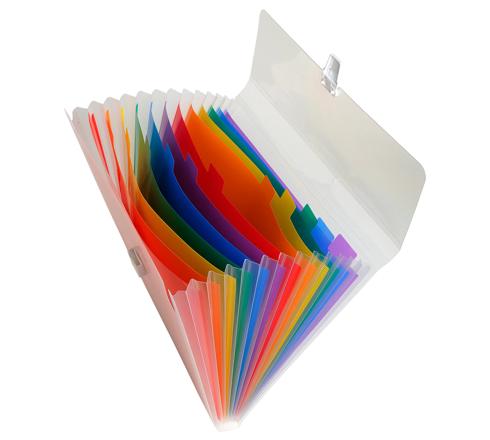 Mit dieser transparenten Fächermappe mit 13 farbigen Fächern ordnen Sie nicht nur Ihre Dokumente, sondern heben sich dank des zweifarbigen Designs auch von anderen ab. So macht die Organisation mehr Spaß.