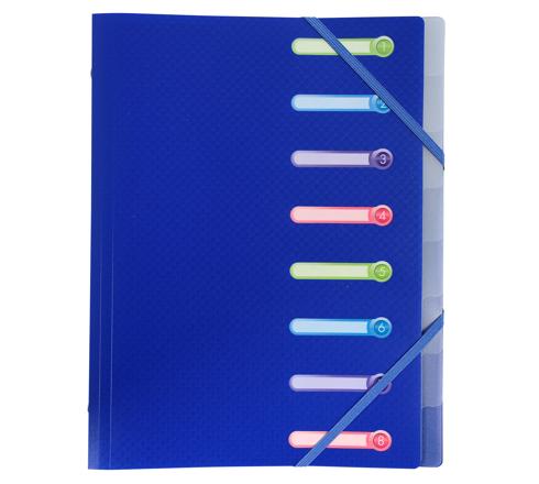 ECKSPANN-ORDNUNGSMAPPE AUS PP 500µ MIT GUMMIZUG UND 3 KLAPPEN, 8 FÄCHER MIT AUSGESTANZTEN INDEX-FENSTERN BLICKDICHT, FÜR FORMAT DIN A4 - FARBEN SORTIERT